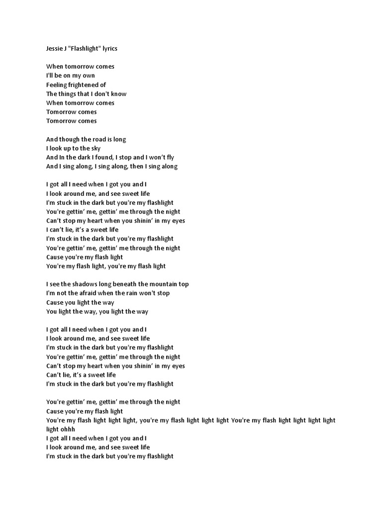 Flashlight Jessie J Cover Version Lirik Lagu Dan Terjemahannya. Download View Lirik Lagu Flashlight as PDF for free. Flashlight Jessie J Flashlight - Jessie J Terjemahan Lirik Lagu Barat When tomorrow comes Saat esok tiba Ill be on my own Aku kan sendirian Feeling frightened up Merasa takut The things that I dont know Pada hal-hal yang tak.
